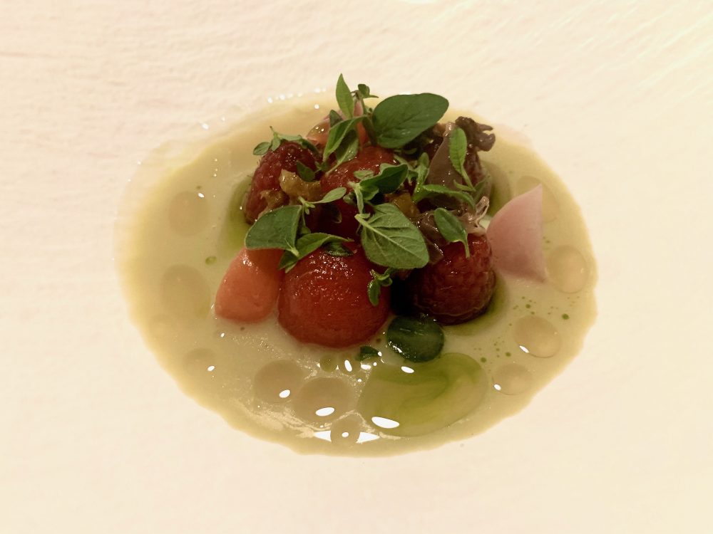 Se la sua cucina seduce sui gusti spinti e più complessi, Caranchini ha ua gande padronanza delle forme più classiche della cucina. Perfetto il suo piccione cotto intero allo spiedo e proposto in un doppio servizio e meravigliosa l’anteprima sulla lepre. «E’ la prima di stagione» ci ha tenuto a precisare lo chef. Una tartare di lepre cruda condita con una vinaigrette fatta col fondo delle ossa ed emulsionata con miele e cera dell’arnia.