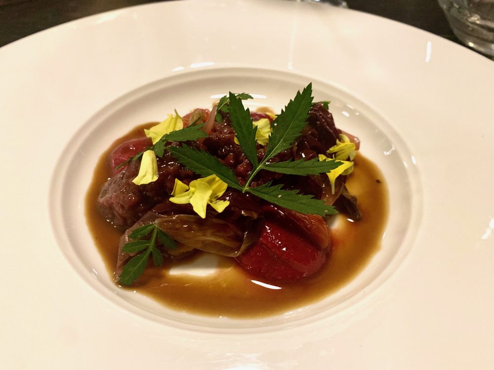 Materia – Tartare di lepre con senape_ vegetali marinati e tagete