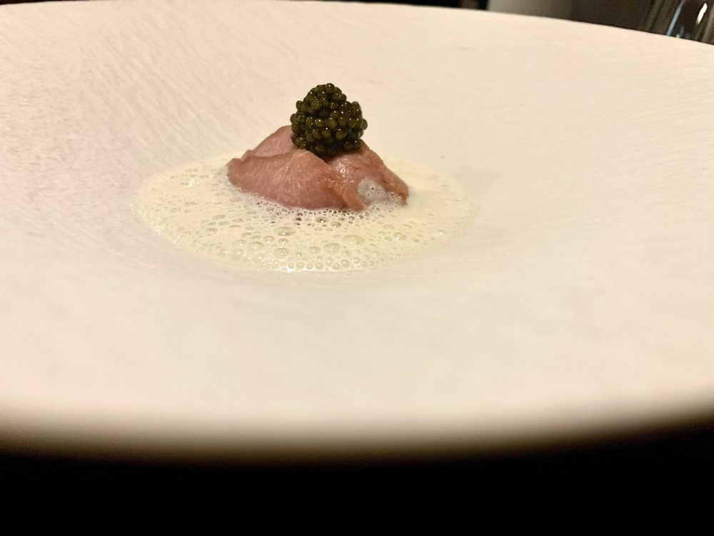 Materia – agnello marinato, nel garum di agnello, cetriolo, sesamo, beurre blanc e caviale
