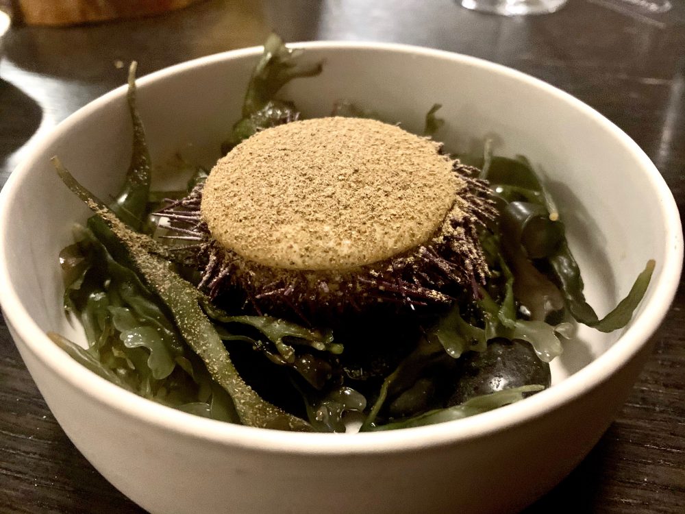 Materia – panna cotta al riccio di mare, spuma di cervella di vitello e polvere di capperi