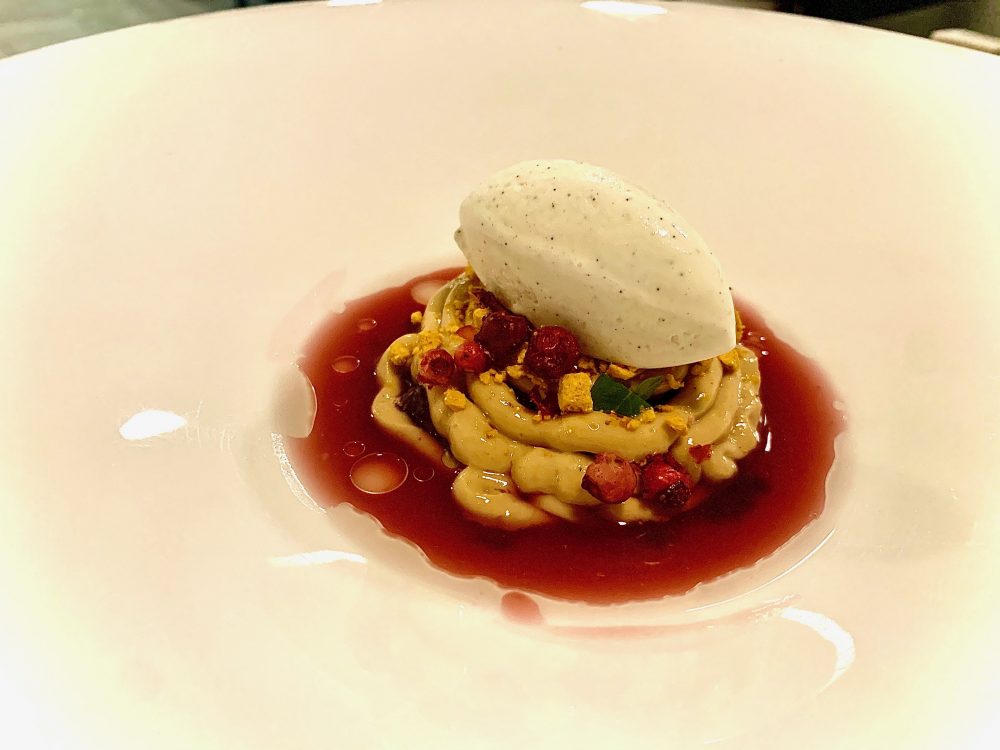 Materia – ricotta fermentata con composta di mirtilli rossi, uva spina, kombucha alla rosa e il gelato alla vaniglia