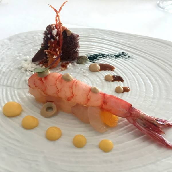 Torre del Saracino, gambero su rombo, mayonese al mandarino e testa di gambero su biscotto di riso nero, polvere di riccio ed anemoni di mare