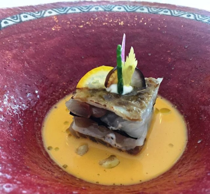 Torre del Saracino, millefoglie di seppia e sauro, su salsa di carota, sedano pomodoro giallo e noci