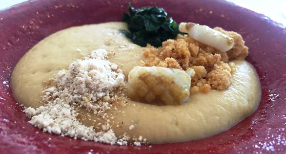 Torre del Saracino, vellutata di ceci, polvere di mais, crumble di finocchietto selvatico con broccoli e bottoni di calamaro