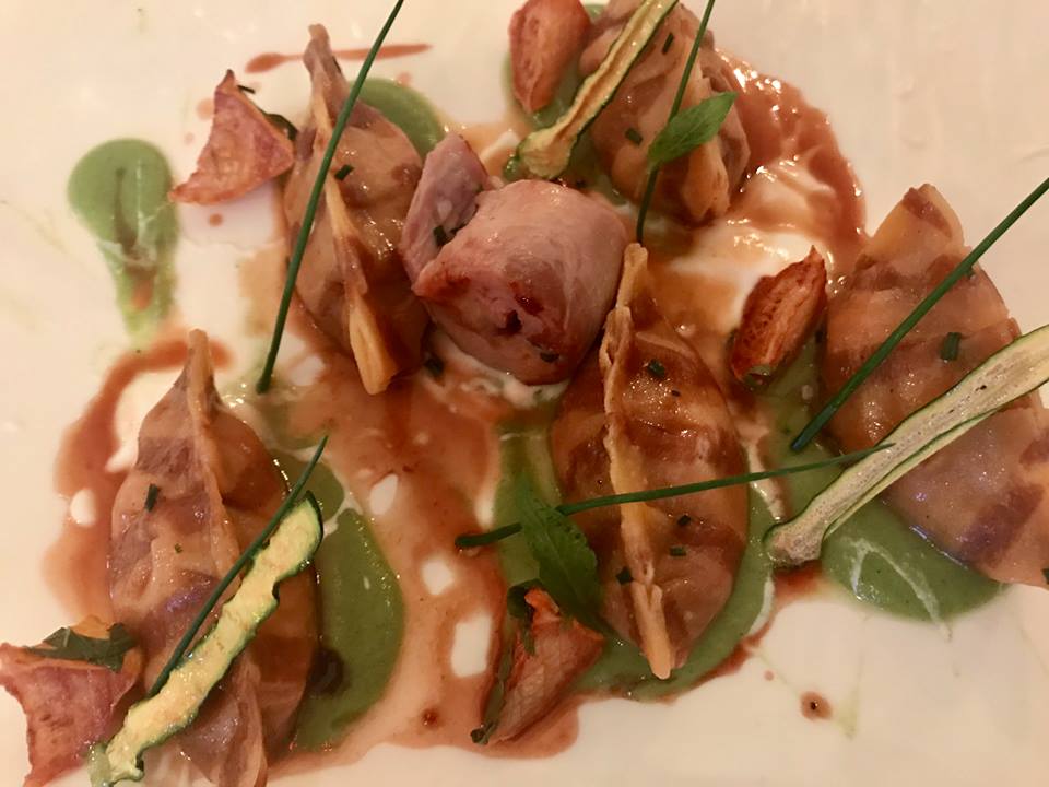Re Mauri, fagottini di grano arso con stracotto di capretto, fonduta di caprino e e scapece di zucchine