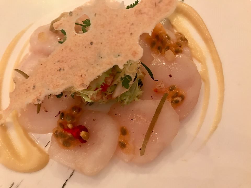 Re Mauri’, capasanta con insalatina aromatica, frutto della passione e cavolfiore in agretto