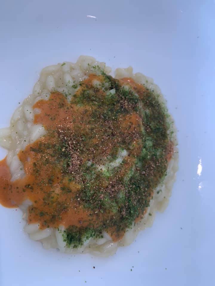 Risotto mantecato con il brodo fatto con le teste di pesce alla brace, spuma al salmoriglio, ricciola marinata. Morbidezza e spessore vanno a braccetto qui.