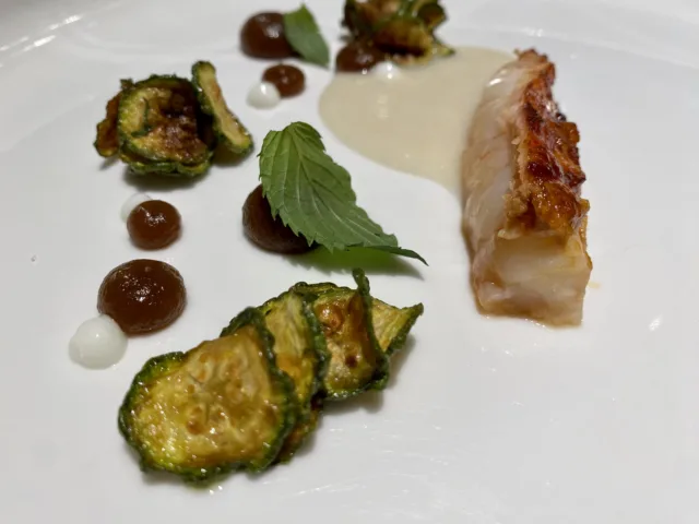Re Santi e Leoni – Baccala’, Zucchine, salsa ponzu e ricotta di mandorla