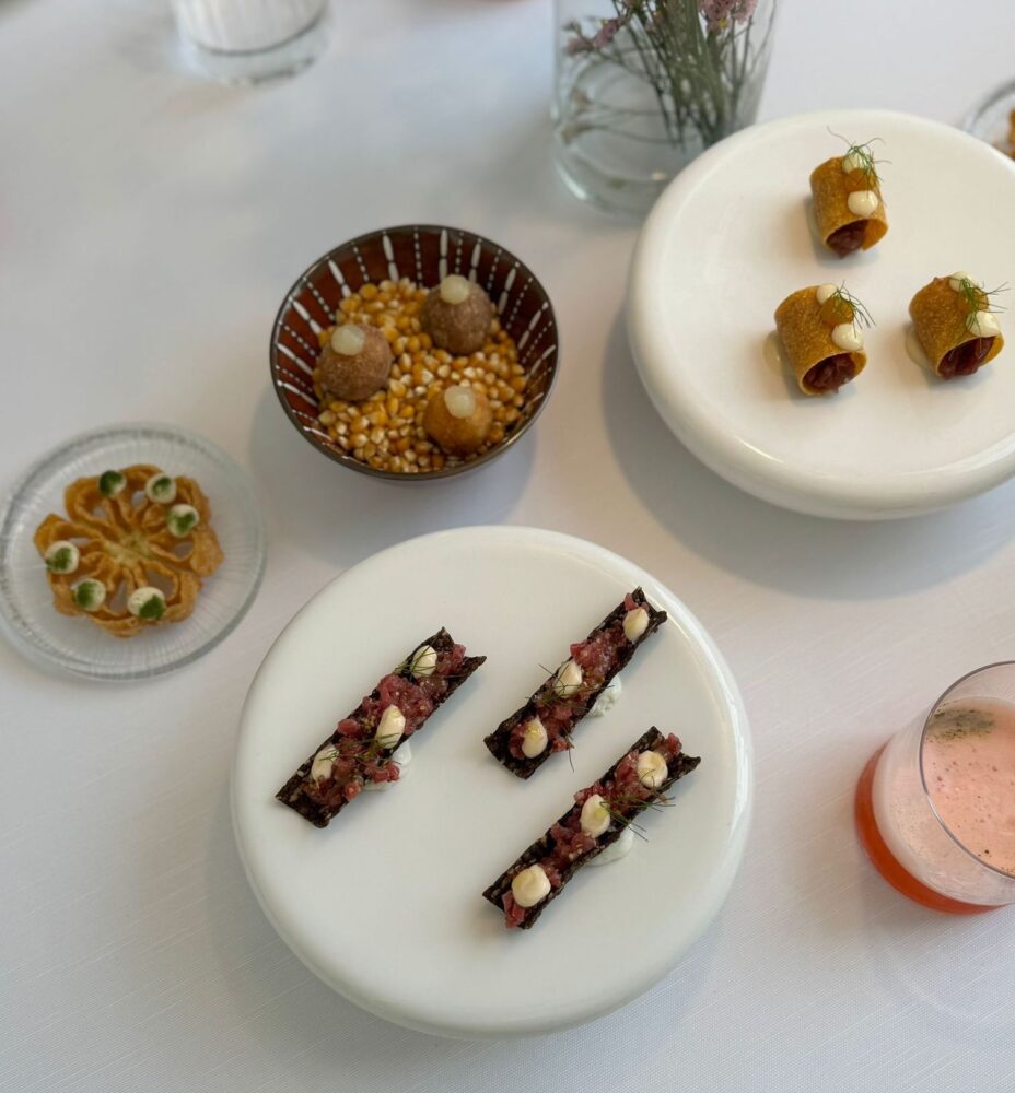 L’aperitivo dello chef Salomone: Bao bun soffritto napoletano e finocchietto; Tacos ostrica e misticanza; Tartelletta sgombro bruciato limone e cavolfiore; Bon bon di baccala e aioli; Gonfiotto maiale teriaky.