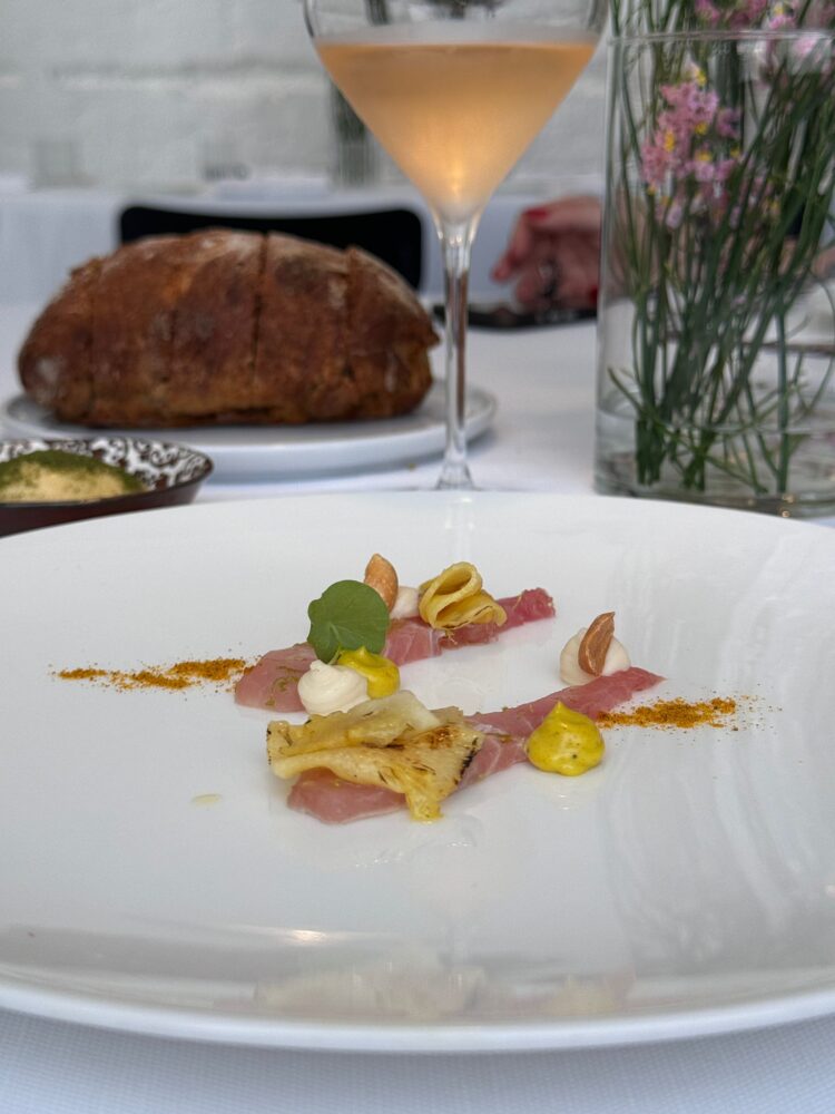 Si prosegue con la ceviche di ricciola, che si rifà a un piatto in stile sudamericano ma che custodisce in sé un ricordo di Bangkok: salsa al cocco, maio al curry, polvere, ananas grigliata e anacardi tostati. Per me uno dei piatti più buoni a menù. Contrasti piacevolissimi, esuberanza esplosiva e concretezza surreale. Ottimo davvero.