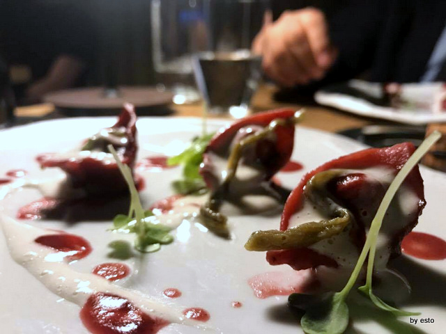 Roji cappelletto alla rapa rossa ripieno di mousseline di palamita, emulsione alla prugna fermentata e melanzane alla scapece