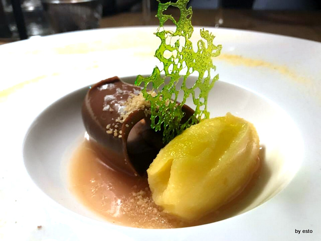 Roji namelaka al cioccolato a latte e sale maldon su zuppetta di pesca bianca , sorbetto all’arancia affumicata , crumble all’olio di oliva.