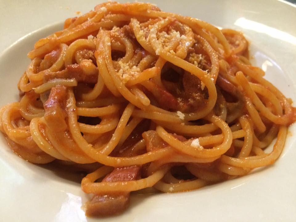 Anche l’amatriciana si segnala per gradevolezza e carattere, il guanciale ben tirato senza essere secco, un buon pomodoro e una cottura al dente della pasta (qui si fa con gli spaghetti).