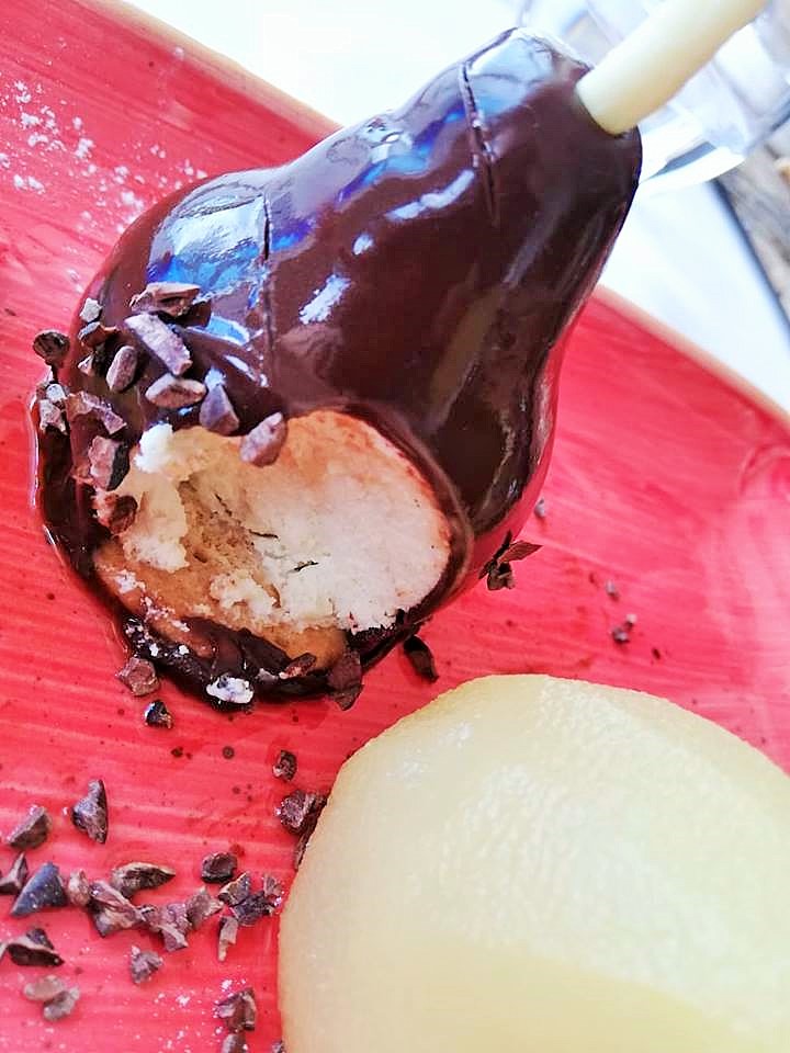 L’altro dessert è la “Pera di ricotta e cioccolato”. Una vera e propria rappresentazione del frutto ma fatta di ricotta dolce ed avvolta totalmente da una copertura al cioccolato fondente su una base di un frollino. Completa il piatto la pera candita e delle goduriose scaglie di fave di cacao.