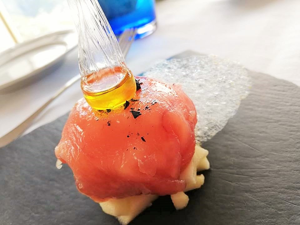 A seguire il bon bon di tonno, un piatto esteticamente bello da vedere ma anche con un sapore capace di lasciarsi ricordare. Il concept innovativo è una piccola sfera contenente olio extra vergine di oliva che, prima di iniziare a mangiare, va rotta sul pesce crudo.