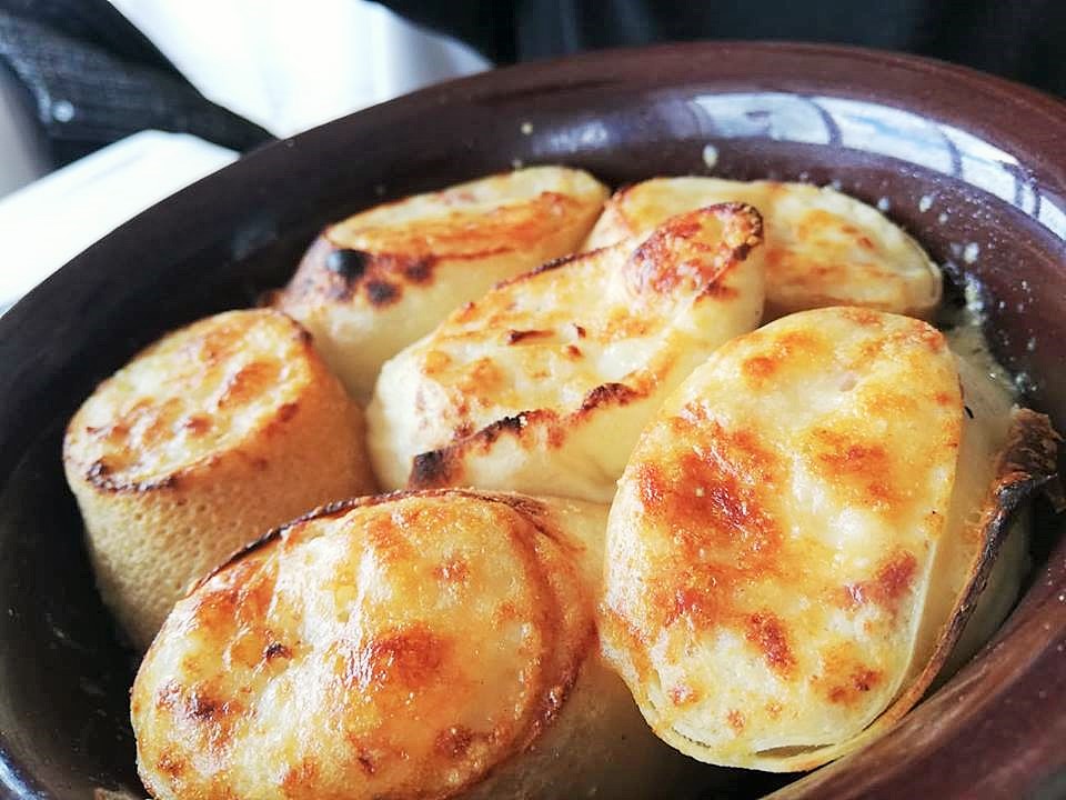 La selezione dei pani racchiude tipi e gusti diversi: c’è il “quadro di pane” accompagnato da olio spalmabile, quasi a fare da centrotavola, il classico filone e poi ci sono i panini: al nero di seppia, alle olive e la focaccina al grasso di maiale.