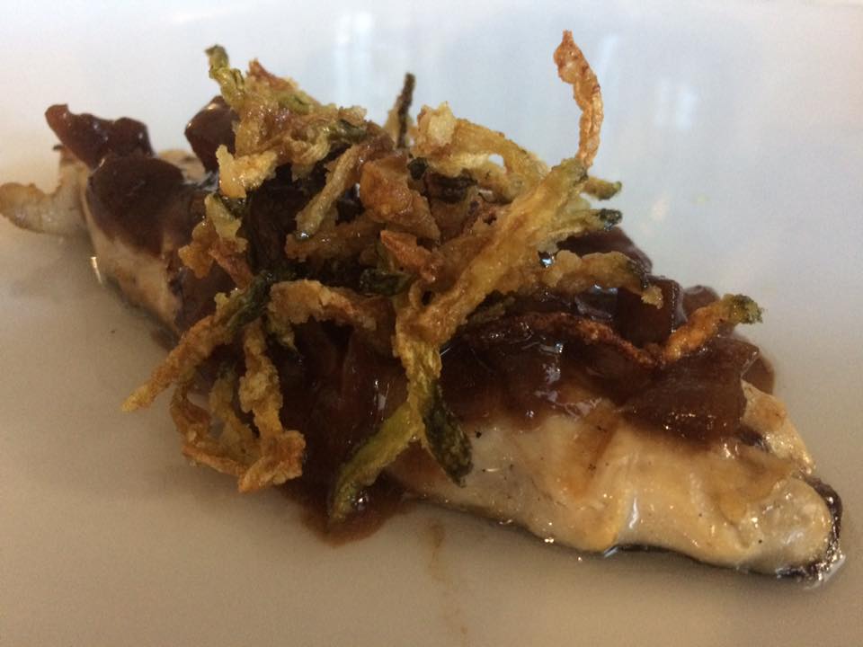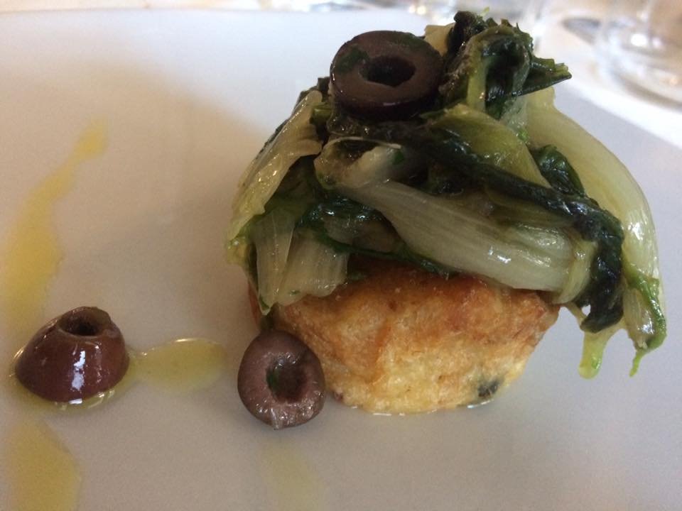 Ancora la suggestione della memoria nella ‘pizza’ di baccalà con le scarole olive e capperi: ingredienti in buon equilibrio, con la sapidità del pesce tenuta a bada dalla pasta del tortino e dalla freschezza della verdura leggermente saltata.
