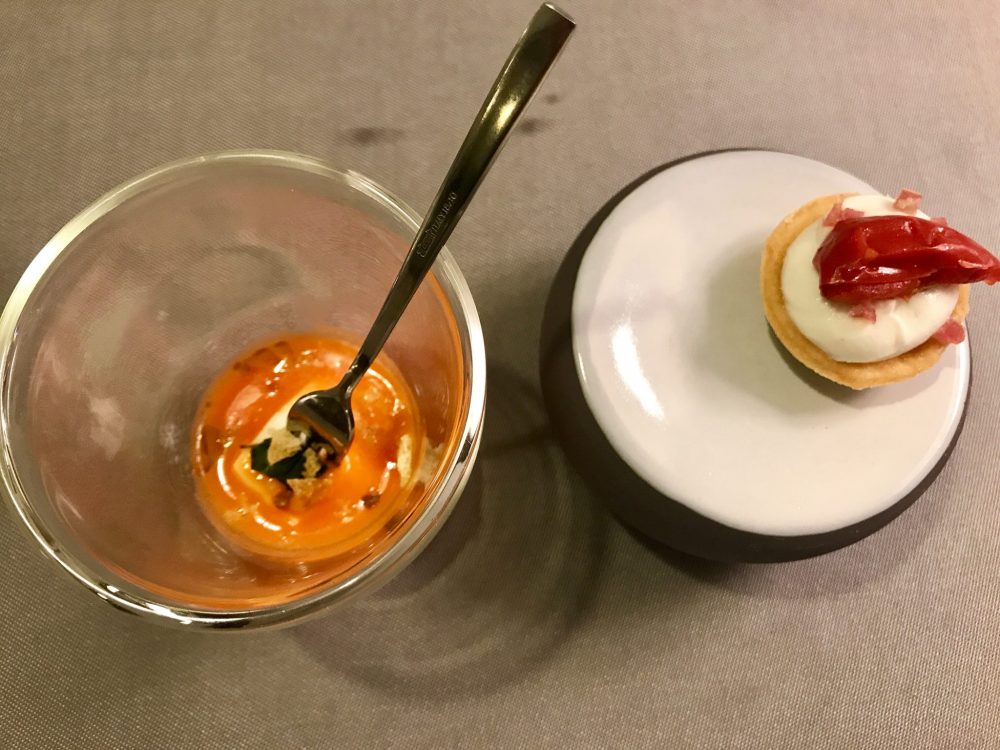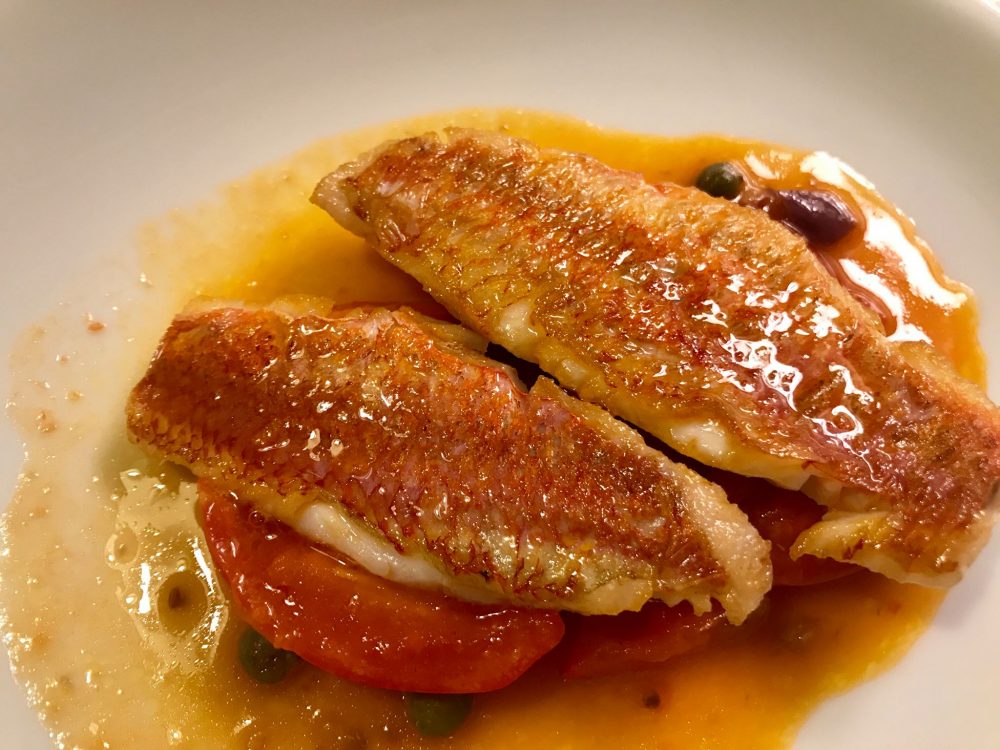 Ristorante Veritas, palamita con crema di pomodorini gialli e capperi
