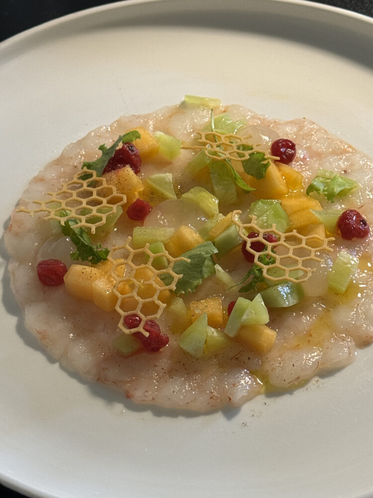 Rocco Trattoria Moderna – Carpaccio di gambero rosa di Mazara del Vallo , gel di limone , frutta fresca , menta e pepe bianco