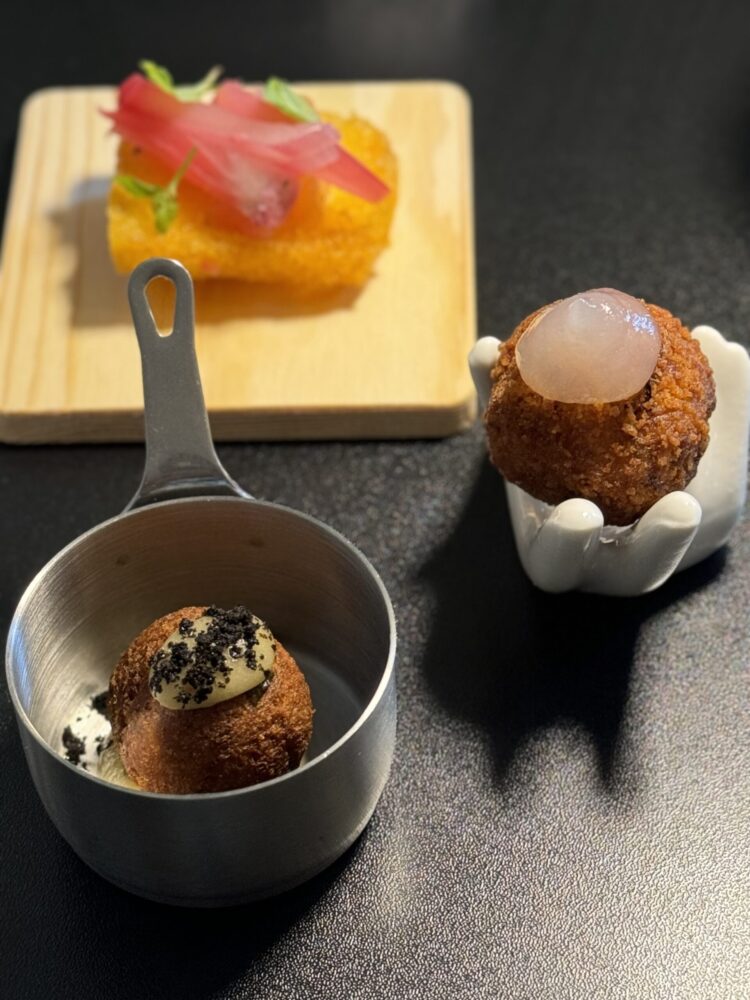 Rocco Trattoria Moderna – Polpettina di pane salsa cimichurry e polvere di olive – Arancino riso patate e cozze e gel di limone