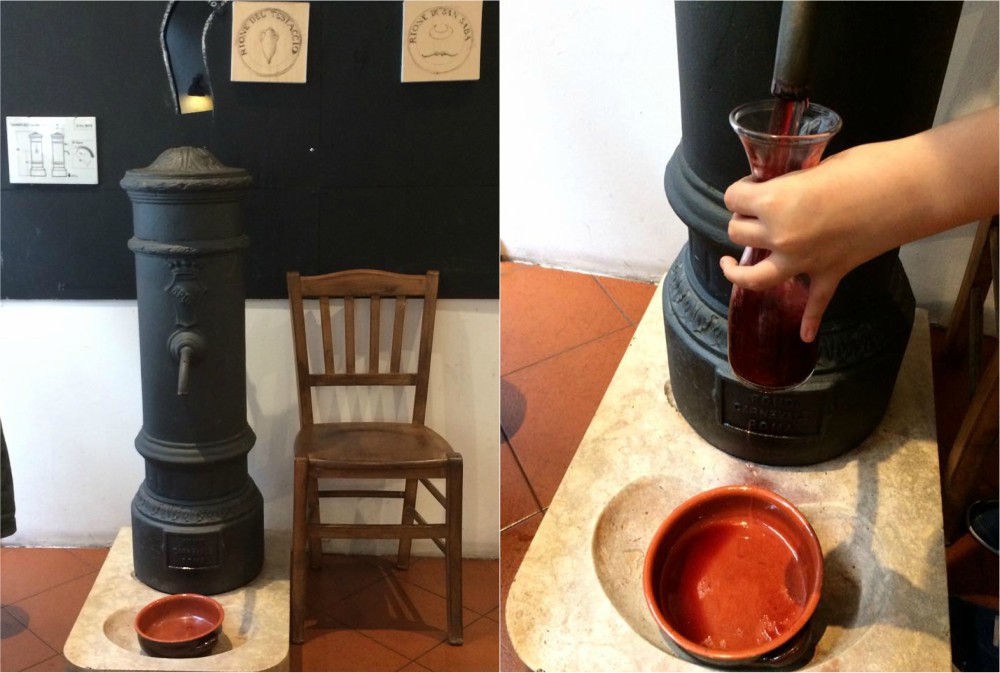 Il nasone che dà il nome all’osteria fa riferimento alla cannella delle fontane pubbliche che si trovano in tanti angoli delle strade capitoline e che il simpatico proprietario ha pensato bene di portare anche all’interno del locale. Il nasone dell’osteria, però, è particolare: al posto dell’acqua fa infatti sgorgare il rosso della casa e ai clienti viene chiesto di servirsi da soli, riempiendo la classica bottiglia da un ‘quartino’, da mezzo litro o da un litro. Sugli scaffali troverete tuttavia anche qualche etichetta regionale, con ricarichi molto contenuti.