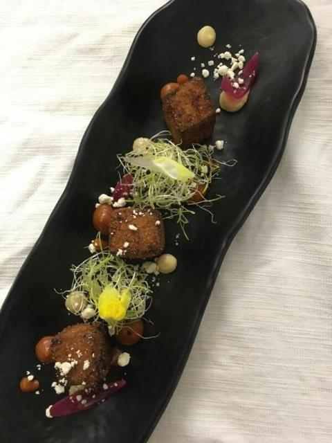 Sfiziosi anche i cubi di coda alla vaccinara fritti su salsa di coda e crema di cipolla fumè con cipolla fluo. I quadrotti sono croccanti e la salsa cremosa alla base crea un piacevole contrasto in bocca.