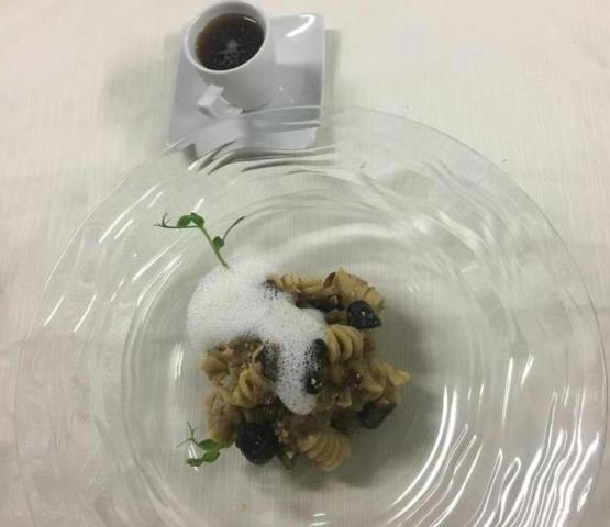 Doppio – Fusillone con ragu’ bianco di cinghiale profumato al Lapsang Tea con finferli e mandorle