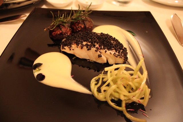 Uno sposalizio che si ritrova anche nell’antipasto di benvenuto: Millefoglie di patate viola, gialle e americane su crema di scorzanera (una pianta originaria dell’Europa Orientale) con chips di scorzanera. L’ortaggio conferisce al piatto quel gusto amarognolo che contrasta con la dolcezza della patata americana. Stesso discorso per il fuori menu di questi giorni: Ombrina in crosta di olive nere, con puntarelle alla romana, rape arrosto, rosmarino e vellutata di patate al miso, un condimento antico e naturale di origine giapponese.