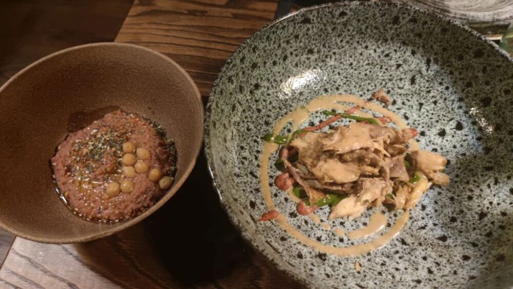 Come prima portata, a tavola sono arrivate le teste di leccia, insaporite con curcuma, caffè e spezie, grigliate e spolpate, abbinate a hummus di barbabietola e ceci, con polline e semi di sesamo, insieme a un cestino di pizza Mastunicola, condita con strutto mischiato a grasso di coniglio, pecorino romano Dop di Cibaria Srl, basilico e pepe.