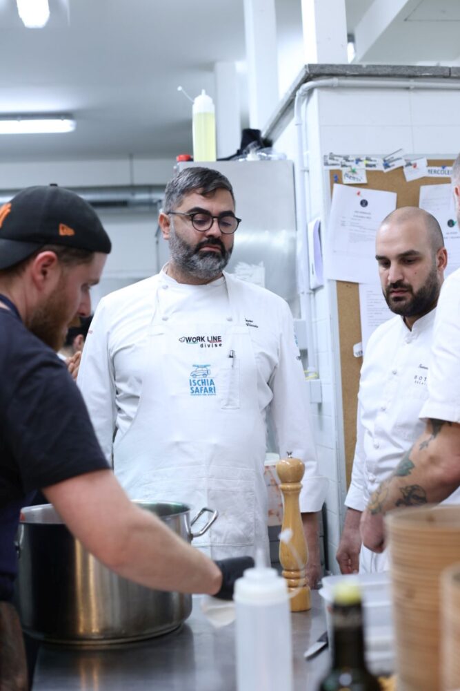 Si è unito al gruppo anche Tommaso Luongo, executive chef de Il Mirto Restaurant, il ristorante veg ischitano del Botania Relais (Stella verde della Michelin), che ha portato in cucina i conigli di fossa e le spezie isolane. Il pesce, invece, è stato acquistato a Fiumicino (RM).
