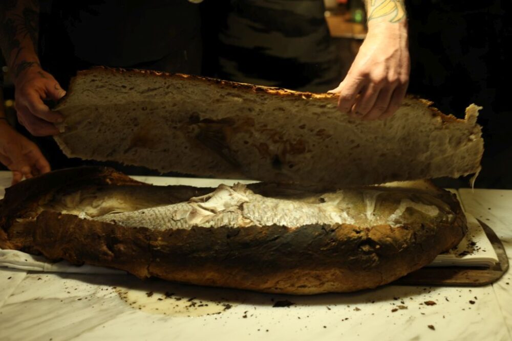 Il momento più spettacolare dell’evento è stato, senza ombra di dubbio, il taglio del dentice in crosta di pane da parte di Gabriele Bonci: il più grande pesava circa 7 chili. Il pesce è stato prima insaporito con spezie e alghe e cotto poi, per tre ore, nel forno a legna di Qvinto: era “una vera e propria opera di artigianato”, come spiegato Pascucci. Il dentice è stato servito con il cavolfiore realizzato dallo chef Luongo, marinato, cotto prima al vapore e poi al camino, insieme al pane a lievitazione naturale con salsa di pizzaiola.