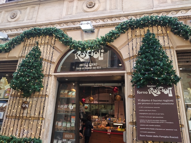 Il pandoro è realizzato con zucchero di canna muscovado, con 48 ore di lievitazione, mentre per i panettoni da Roscioli Caffè si vendono in diverse varianti: il classico in vasocottura, al caffè, arance e cioccolato Dulcey (bianco con gli zuccheri caramellati), ai marroni canditi con pasta di pura mandorla di Noto nell’impasto e, infine, con i frutti di bosco.