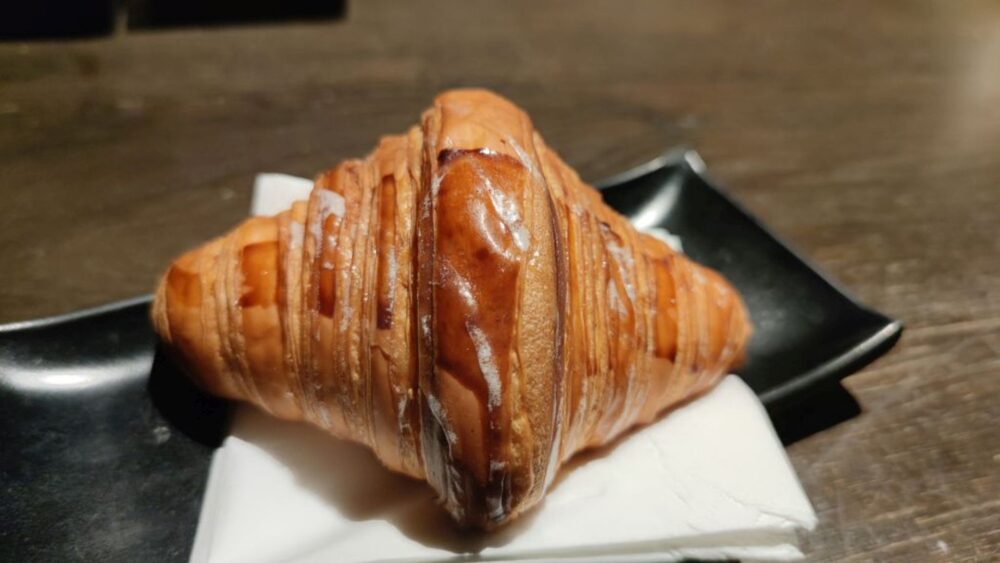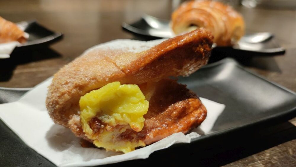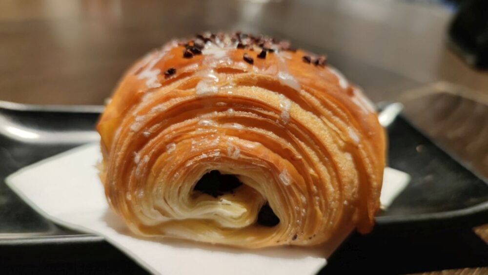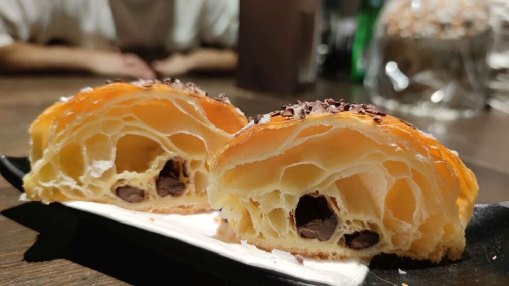 Il pastry chef lavora procedendo con una lievitazione mista, panettoni esclusi. Per la linea della colazione sul bancone del bar sono protagonisti il cornetto sfogliato all’italiana, il cestino di frutta, le girelle all’uvetta, il fagottino al cioccolato, il ventaglio, il “ciavattone” con pasta sfoglia caramellata e crema o confettura di albicocche.