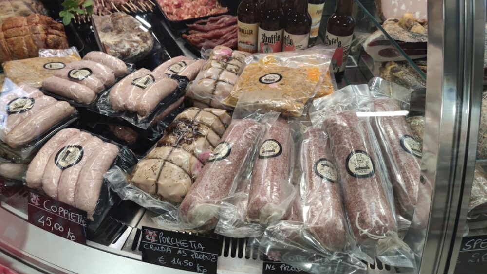 Il banco è ricco di specialità: una menzione particolare va al prosciutto cotto affumicato e al carpaccio di maiale. Buonissimo anche lo scamone condito con le spezie.