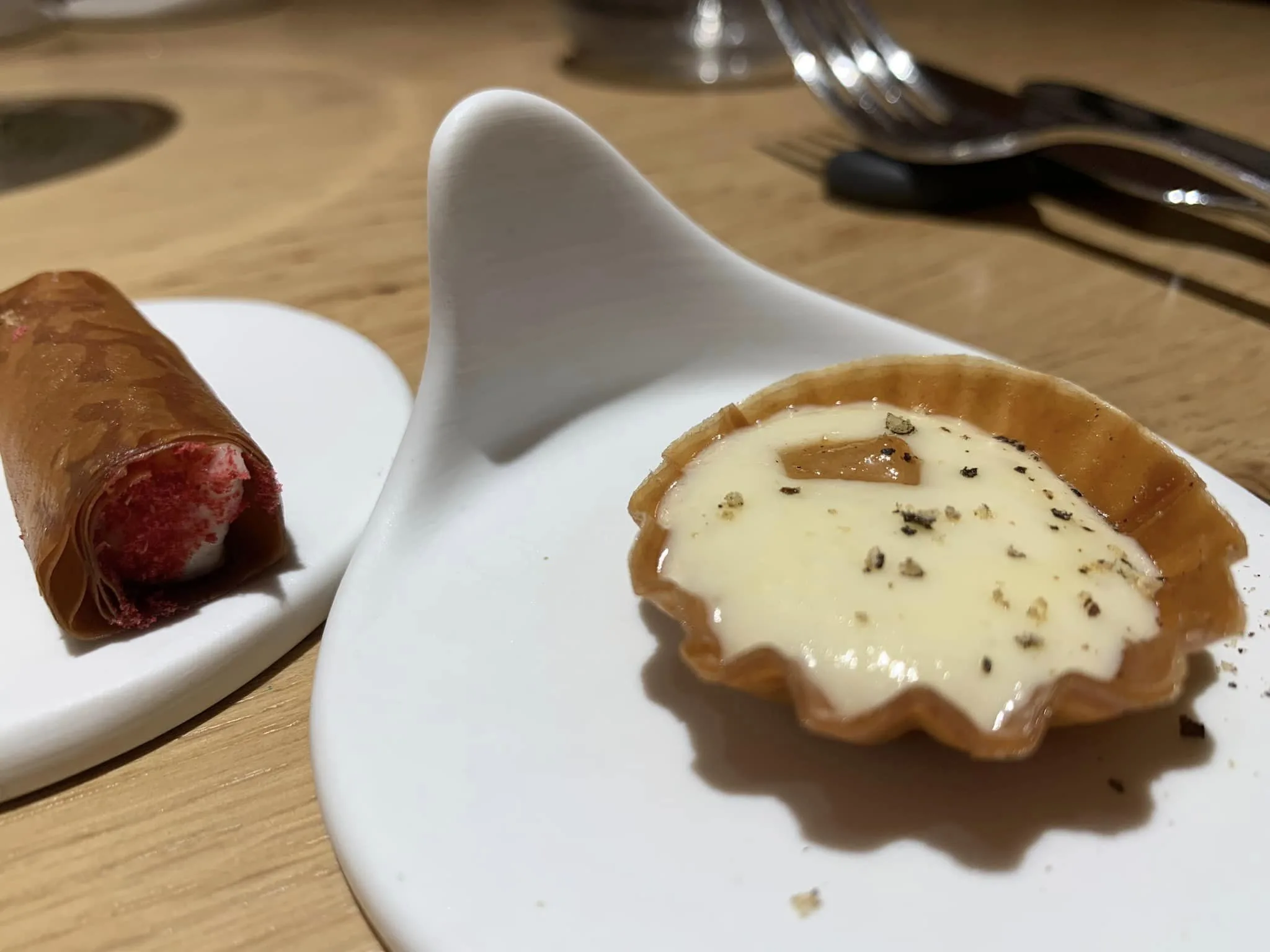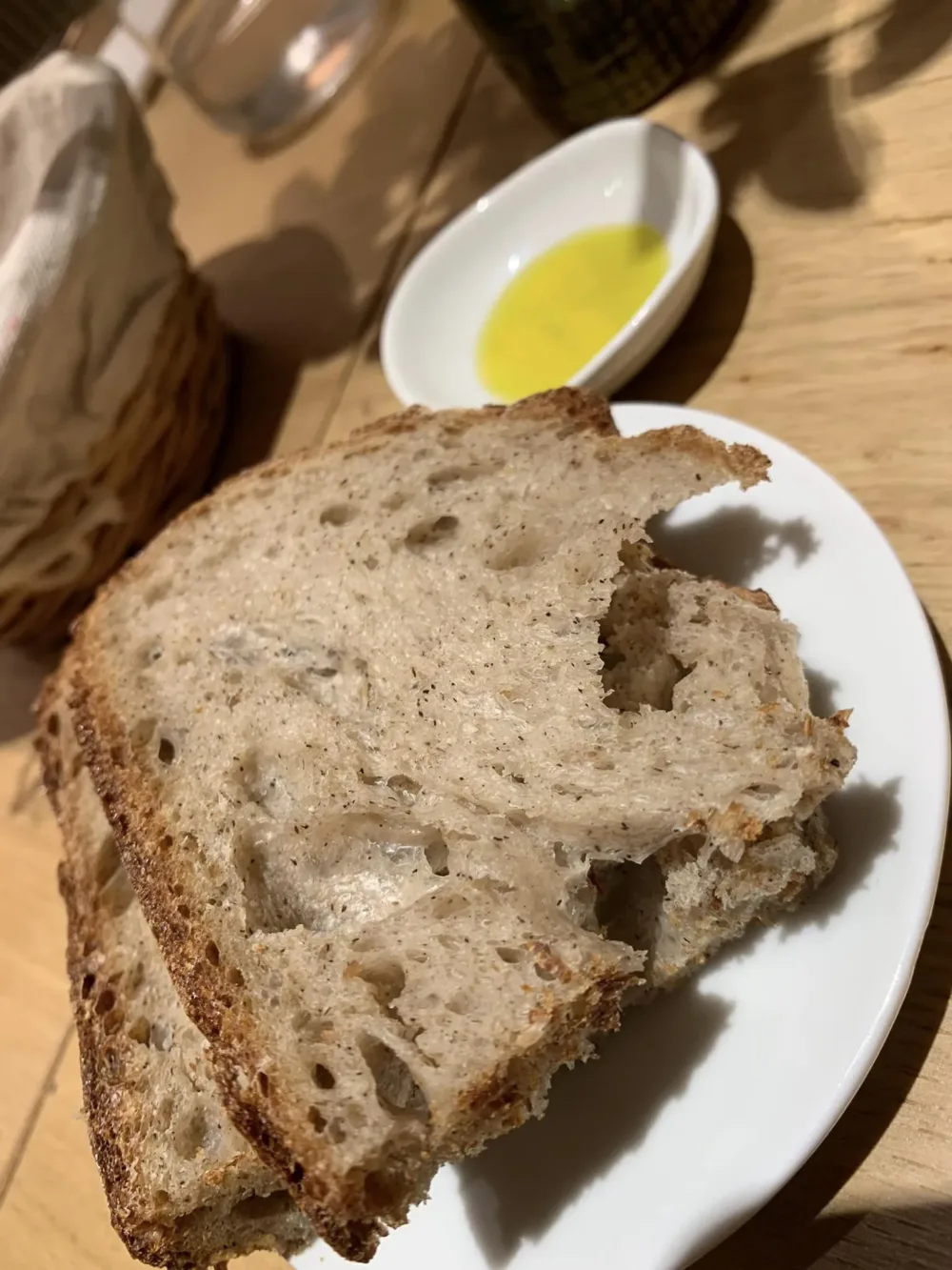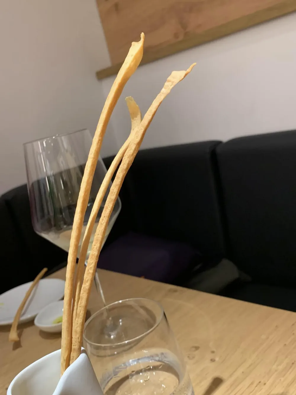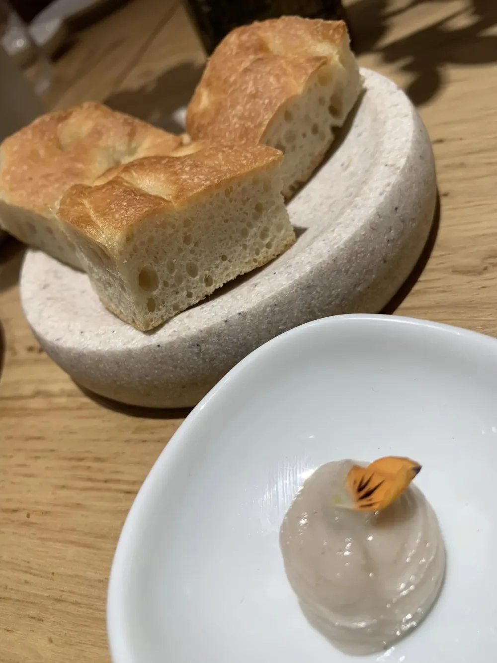 Al tavolo, intanto, l’amuse bouche dà un benvenuto frizzantino; il pane è buonissimo (viene da un forno del quartiere) così come l’extravergine in degustazione e i grissini fatti in casa. La focaccia viene servita con una nuvoletta di lardo.