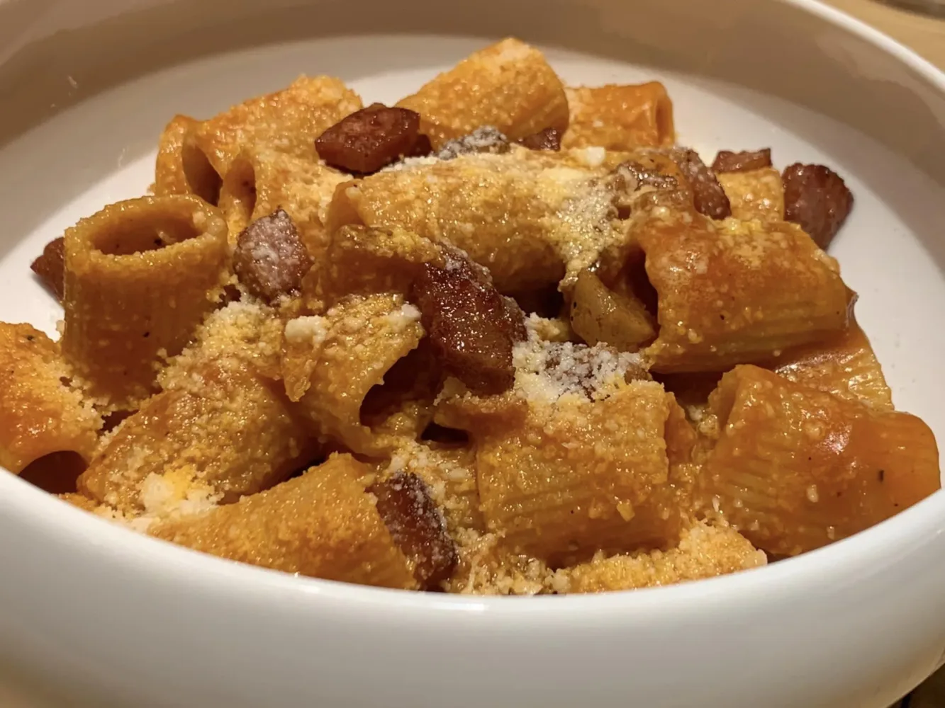 Nella Fase 2 (primi piatti) ammetto di essere andata al sodo: amatriciana. Un po’ provocatoriamente, un po’ (credo) per togliersi dai piedi i talebani della ricetta originale, qui viene scritto sul menu «Non è un’amatriciana». La ricetta di Salvucci prevede infatti qualche goccia di aceto balsamico (questa non è una novità, lo sappiamo) e una base di scalogno. Com’è? A me e ai compagni di tavolo è piaciuta tanto. Mezze maniche dal punto di cottura indovinato, pomodoro solo un’ombra addolcito e pronto così ad accogliere la sapidità del pecorino e di un guanciale al quale si è fatto rilasciare sapore senza sfibrarlo o – peggio – rinsecchirlo.