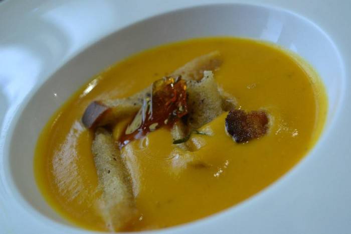 Benvenuto di apertura: passata di zucca mantovana, pane tostato, caramello al cumino e polvere di caffè