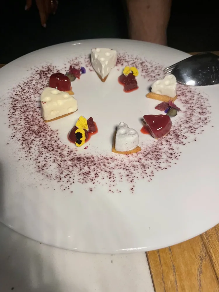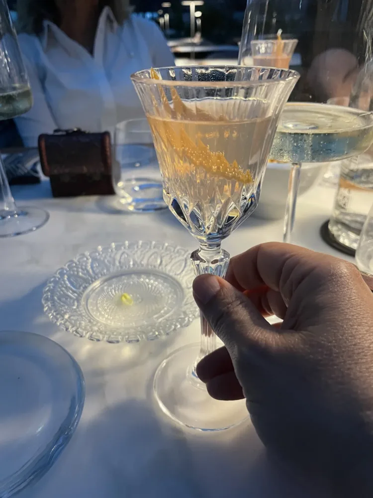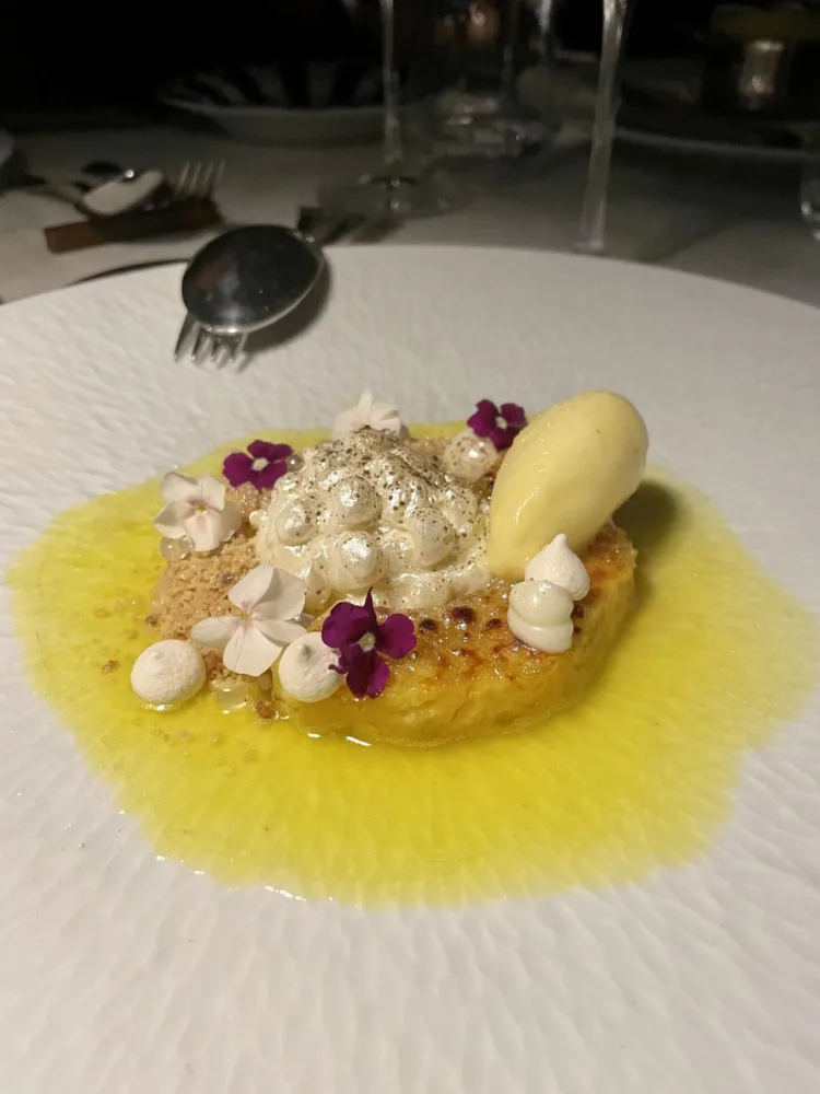 Il Roccocò con salsa al pisto e sorbetto al Kahlùa; Pina Colada con gelato all’ananas affumicato e caviale di Malibù, la Cheesecake ai 4 formaggi e sorbetto ai frutti rossi, Foufflé alle albicocche Pellecchielle e gelato alla vaniglia e ancora piccola pasticceria che comprende biscottini al cacao e semi di sesamo, mini foresta nera, bon bon al cocco, finto sasso di crema fritta, tartufino al cioccolato fondente. Un’esperienza di stile ben accompagnata anche dai vini Franciacorta Brut Contadi Castaldi, Sauvignon Winkl 2021 Cantina Terlan, Kaid Syrah Alessandro di Camporeale, la carta è curata dal sommelier Rudy Travagli.