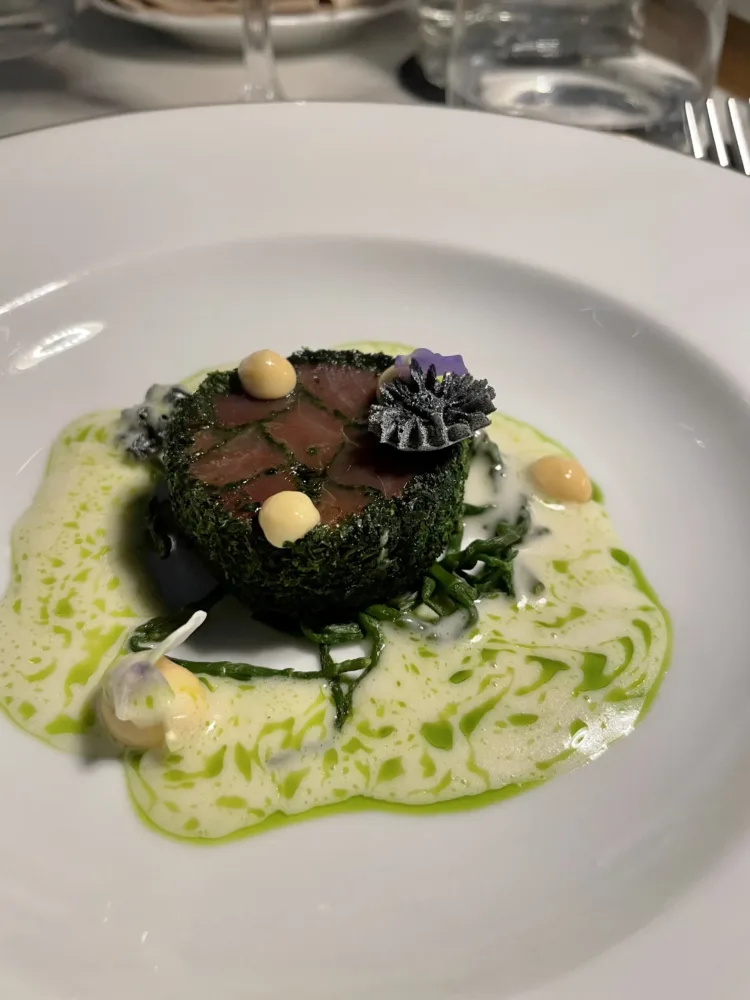 Un tripudio di sapori e fantasia seguiti dall’antipasto di Palamita affumicata, bagna cauda e asparagi di mare.