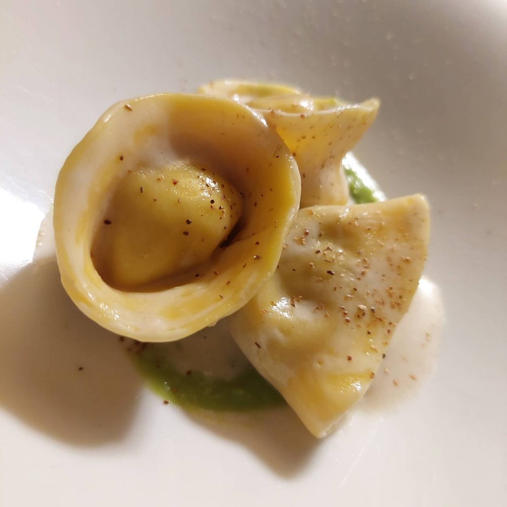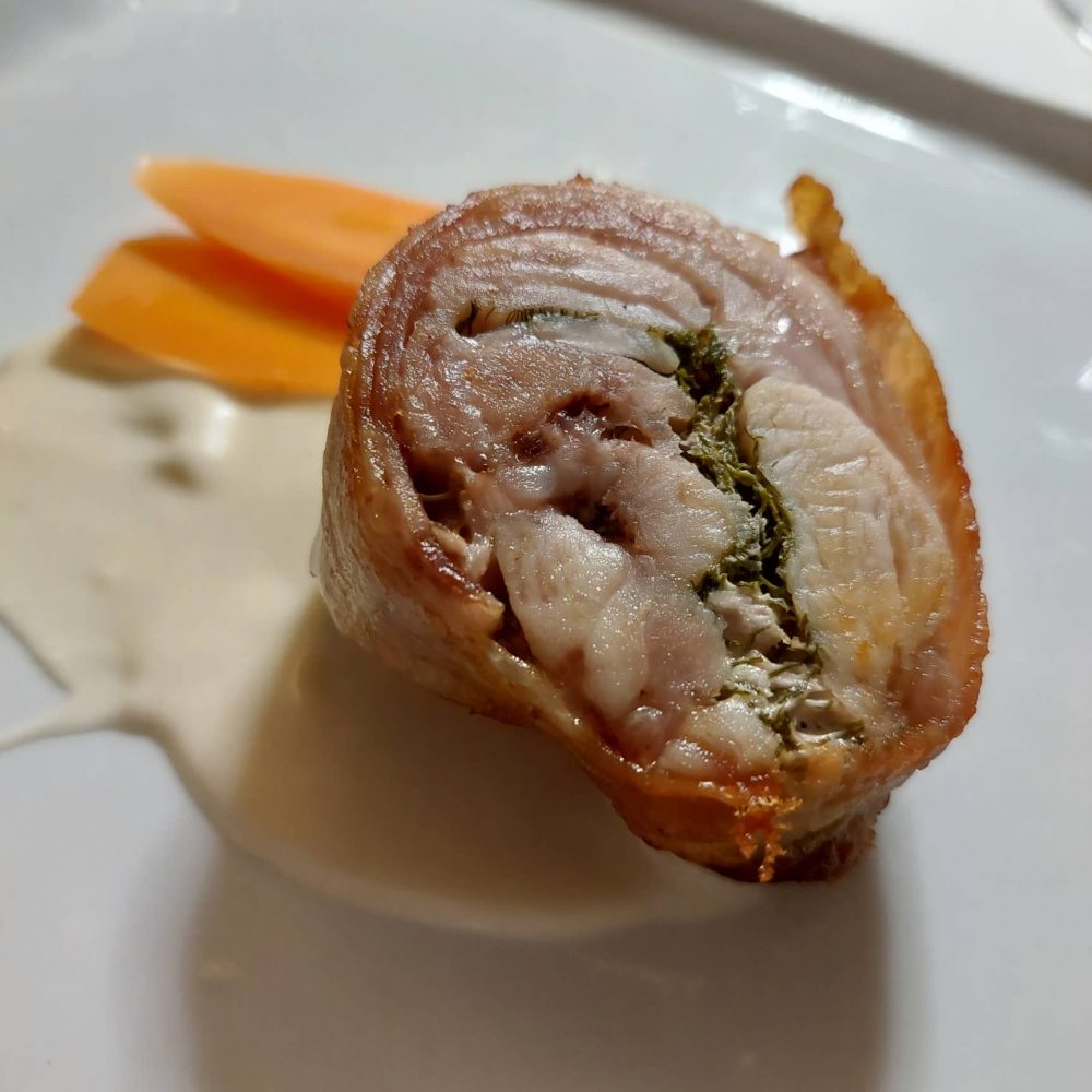 La pasta è fatta in casa e la delicatezza si sente appieno nei ravioli di salsiccia, purea di piselli, panna ai funghi ed essicazione di porcini. Il secondo è un classico storico della casa, dove la tradizione si esprime al suo meglio, trattasi del coniglio porchettato con pancetta, fondo di cottura emulsionato e carota in agrodolce. Il piatto iconico della Degusteria.