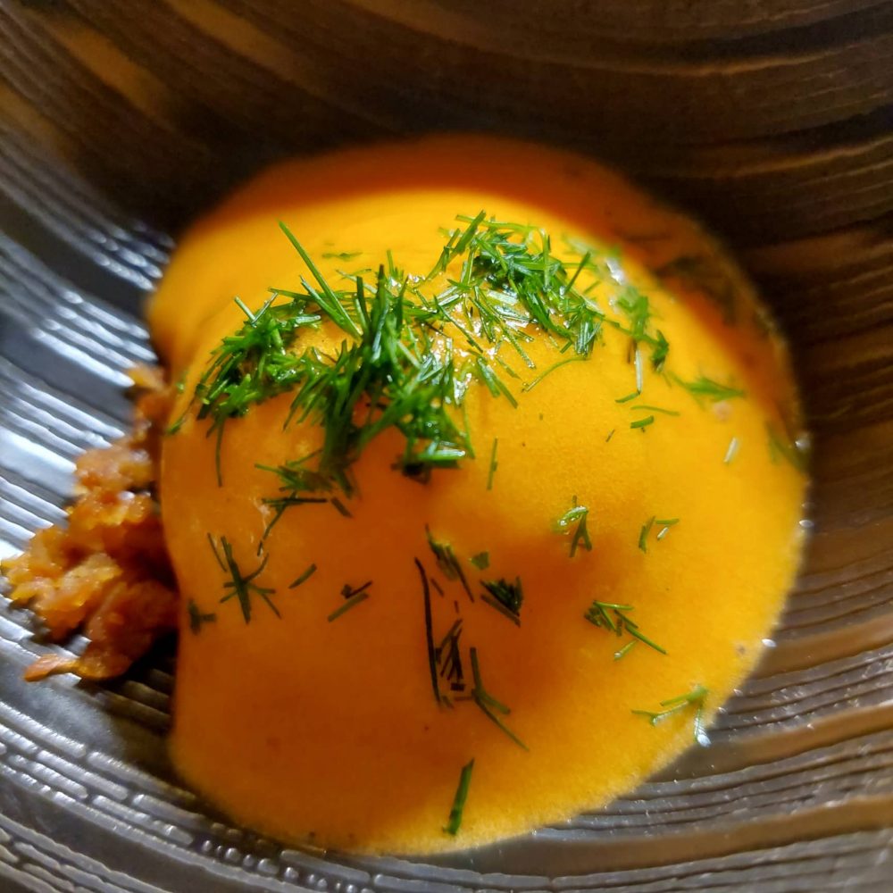 La delicata e profumata spuma di pomodoro in porchetta, uovo poché, guanciale e finocchietto e a seguire l’agnello, peperone crusco su salsa di patate e carote e insalata marinata da leccarsi i baffi.