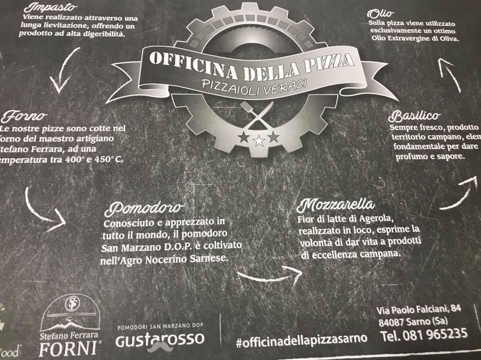 Perché officina? Beh, perché il padre Mimmo ha una officina meccanica ma a Mario questo lavoro non mai piaciuto troppo. Ha preferito seguire la via della pizza, ha studiato, fatto corsi da Giorilli e grazie a lui ha deciso di inserire la biga nella pizza conuna attenzione alla lievitazione e agli impasti, circa48 ore prima di finere nel forno.