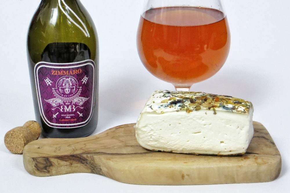 Lo stracchino ha una crosta fiorita su cui sono presenti i fiori eduli. Il formaggio si presenta a pasta molle, molto compatta. Al gusto regala note muschiate, di frutta secca (a me ricorda la noce) e speziate, con una buona freschezza data dalla leggera acidità. Dal punto di vista tattile è cremoso, con una buona grassezza. In abbinamento ho scelto la Zimmaro di Bella ‘Mbriana, Italian Grape Ale a fermentazione spontanea, con mosto di Caprettone del Vesuvio. Questa birra si presenta con note fruttate che ricordano gli agrumi e una buona acidità morbida. Dal punto di vista gustativo, le note fruttate della birra completano quelle del formaggio, amalgamandosi in maniera armonica. L’acidità è fondamentale, insieme al buon grado alcolico, per la pulizia del palato dalla grassezza del formaggio.