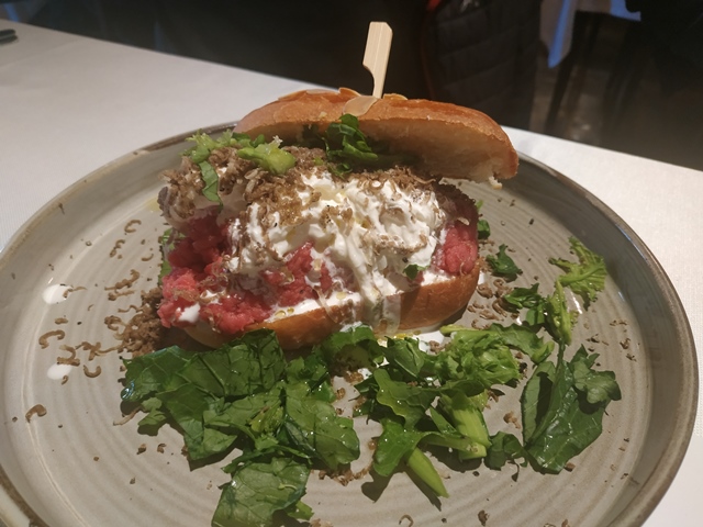 Tra gli antipasti, molto interessante l’hamburger con battuta di vitellone bianco brado dell’Appennino Ipg Macelleria Bottega, con stracciata di bufala, uovo di quaglia, insalata di broccoletti e tartufo uncinato dei monti Simbruini (12€).