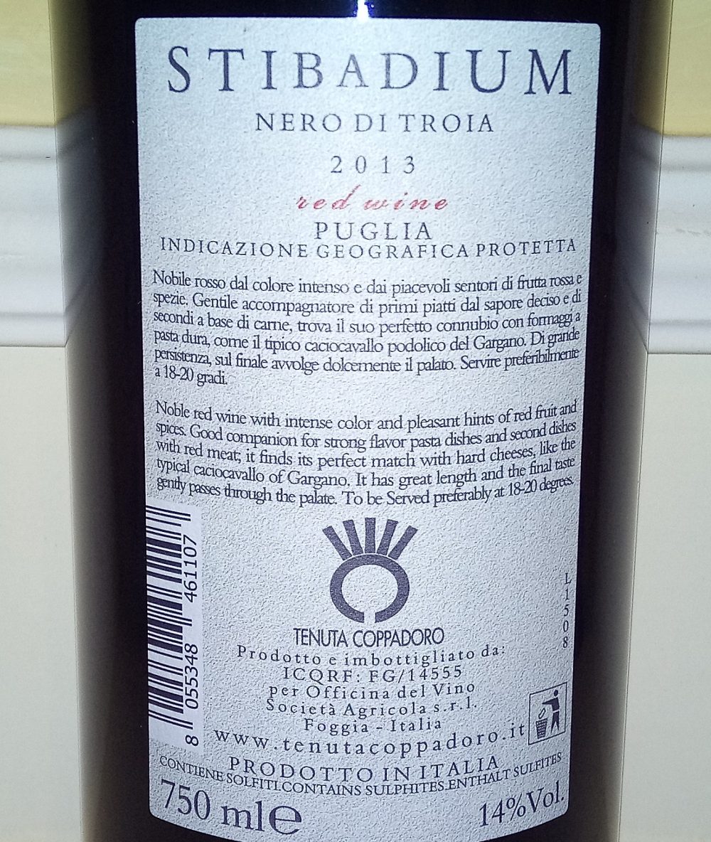 Controetichetta Stibadium Nero di Troia Puglia Igp 2013 Coppadoro