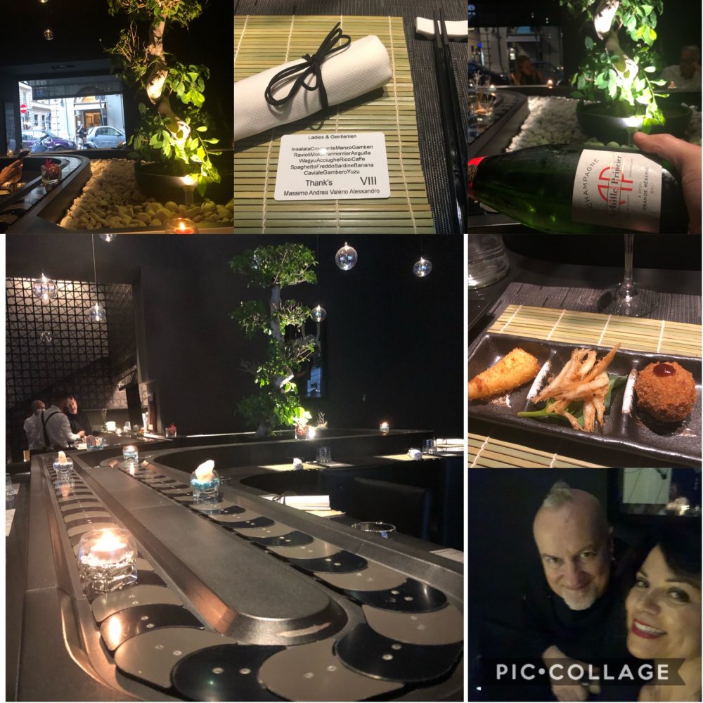 Si inizia con un cocktail Ugo fatto con sakè spumante e naturalmente sambuco, si prosegue con sakè caldo e freddo per finire con un sorbetto al Campari che rinfresca il palato. Ci si sorprende davanti a piatti che arrivano in una scatola di lacca nera o quelli che vengono completati personalmente da Viglietti al tavolo. Le chips di patate sono spalmate di mousse di quinto quarto un omaggio alla romanità, gli spaghetti sono di patate e la soba è fredda il dessert da comporre di banane e caviale ha un gusto decisamente erotico come veramente inconsueto è l’ultimo dessert di gamberi.