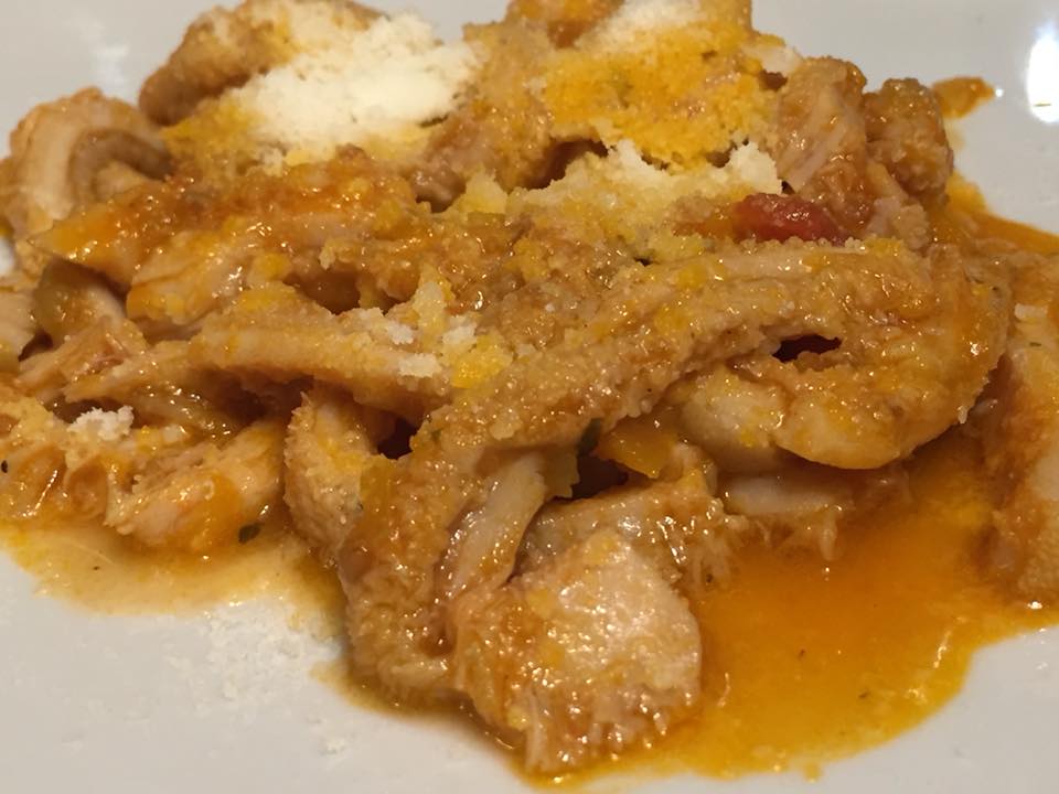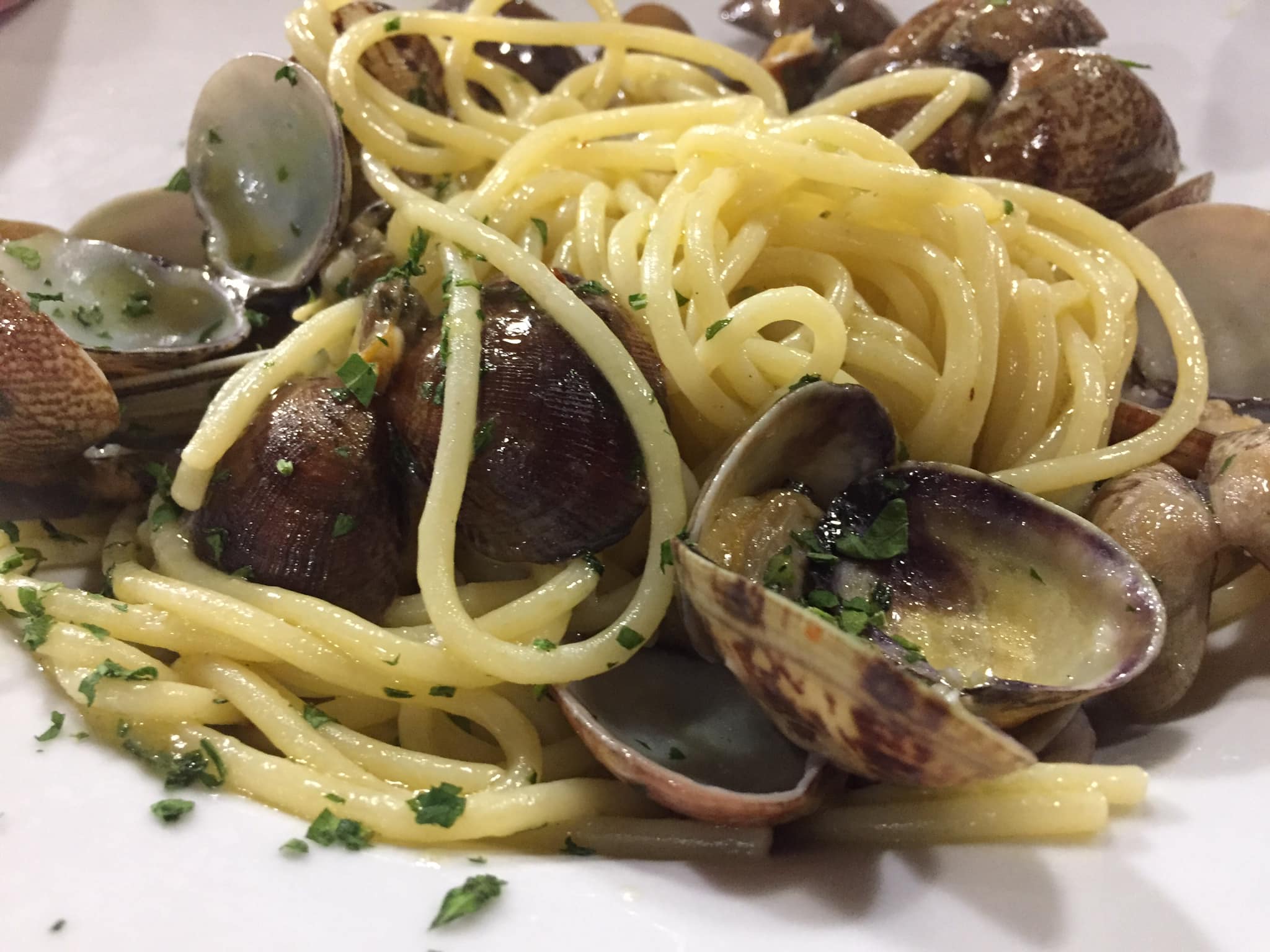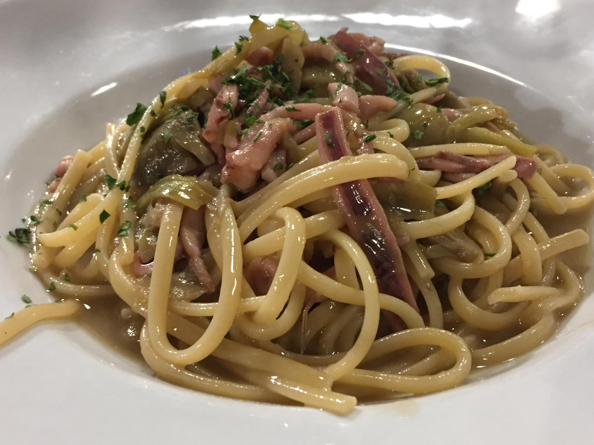 Riusciti gli spaghetti con le vongole, molto di più le linguine con totani e carciofi: ricetta super indovinata, che viene voglia di ripetere a casa (anche se stavolta era un po’ troppo acquoso il sughetto sul fondo del piatto).