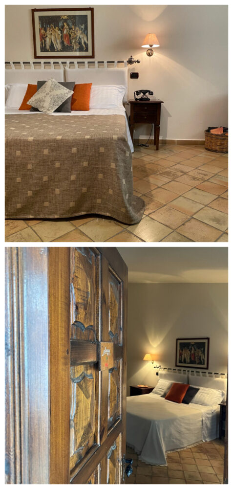 Dopo una passeggiata serale in centro, a Venosa, a pochi metri dalla struttura, alla scoperta della Cattedrale di Sant’Andrea, nei pressi di piazza municipio, la Chiesa incompiuta e il Castello Aragonese, simbolo di Venosa e uno dei suoi tesori architettonici più importanti, siamo rientrati in Tenuta, nella nostra camera ciliegio.