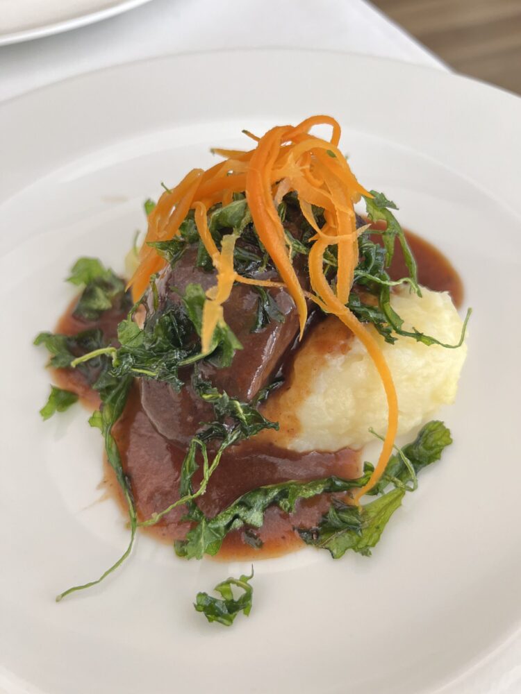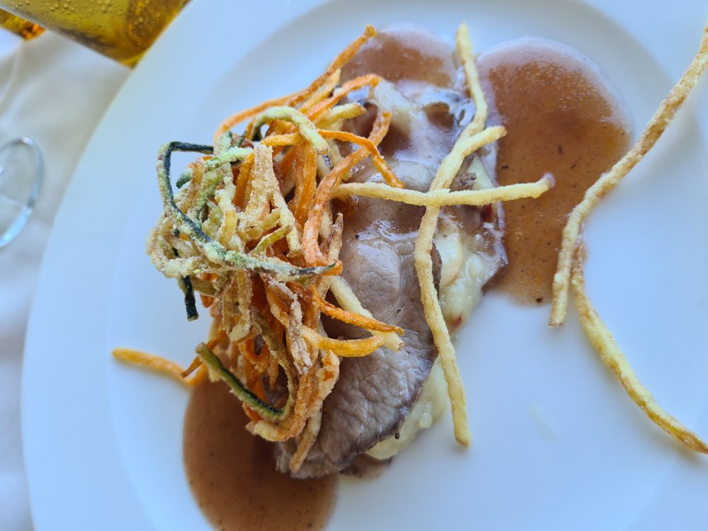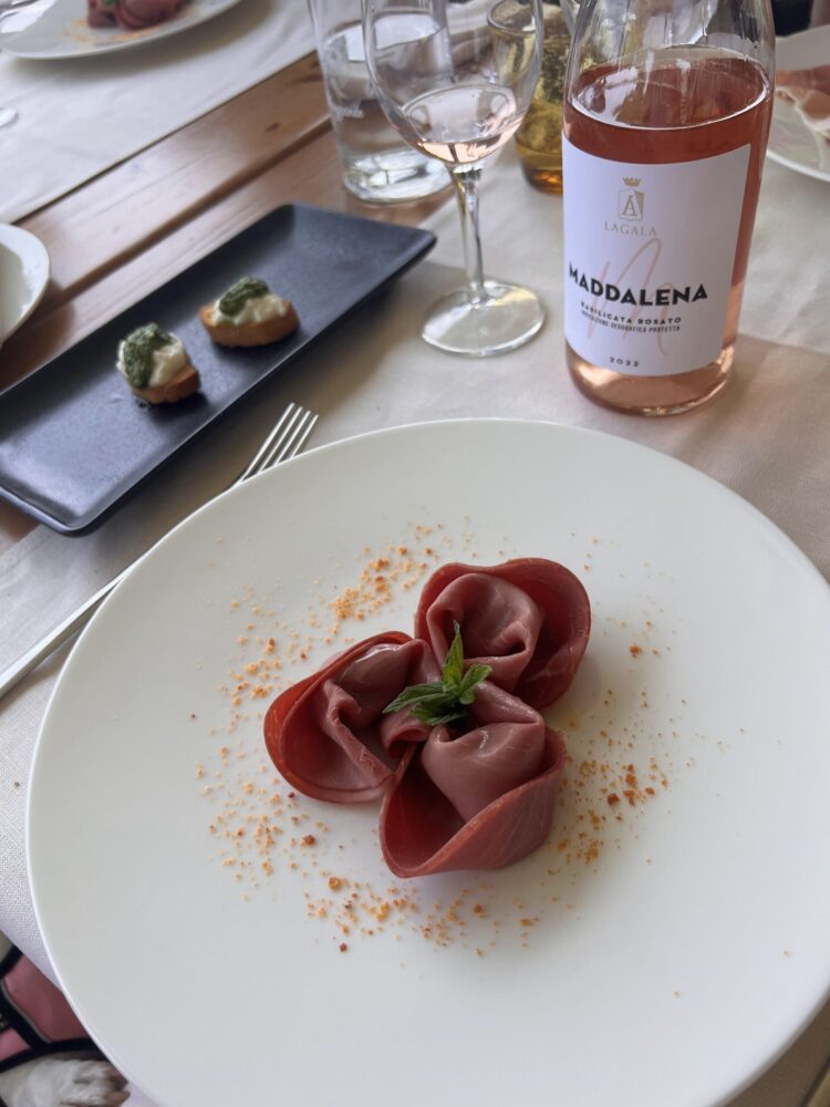 Dopo la visita in cantina, una passeggiata tra i vigneti e un ultimo tuffo in piscina, prima dei saluti mi concedo un pranzo lucano esclusivo, con un manzo stufato con mandorle tostate e riduzione all’aglianico del vulture, parmigiana di zucca, pettole con pomodorino, fiori di zucchina pastellati, polpette di pane al sugo di pomodoro fresco, un antipasto genuino, bilanciato e stimolante.