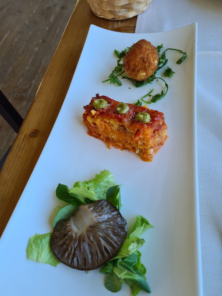 Si parte con l’antipasto, oserei dire “rinforzato”. Quello freddo è con mozzarella, salumi ed un ciuffo di ricotta con marmellata di arance amare mentre l’orto ruba lo spazio con la proposta calda con un fungo grigliato, la parmigiana di verdure e un golosissimo uovo ripieno. In accompagnamento ci sono poi le frittelle di pasta con i pomodorini e le olive locali, servire tiepide nel tegamino.